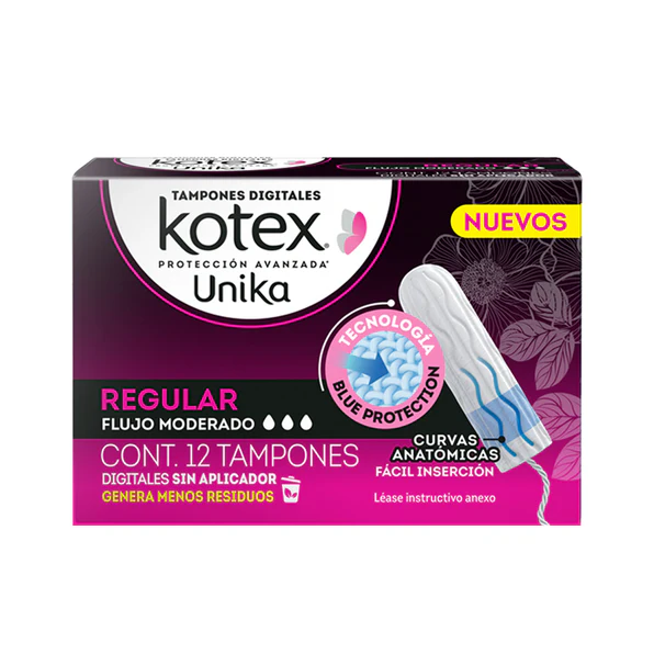 Los tampones digitales Kotex® Unika te brindan protección con tecnología BLUE PROTECTION y menos residuos.