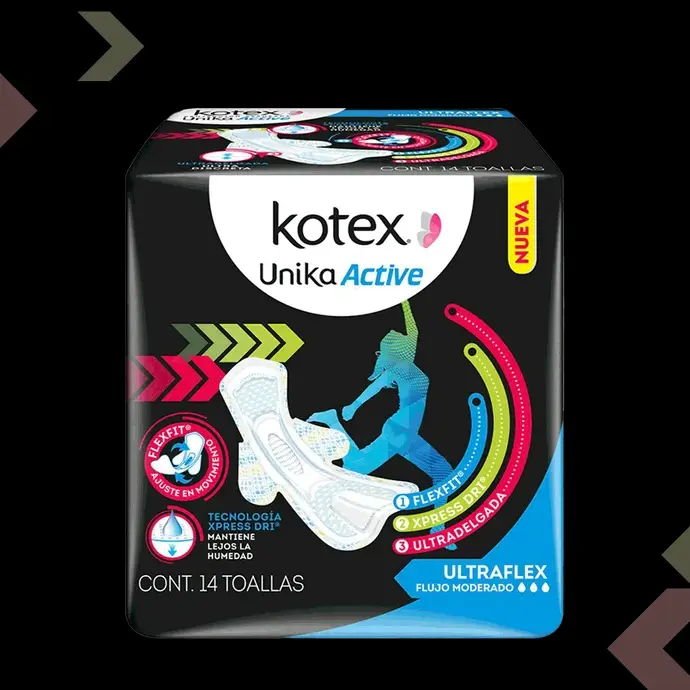 Para ti que te mantienes activa todos los días te presentamos la nueva Kotex® Unika Active la única toalla que te brinda la mayor comodidad y seguridad adaptándose al ritmo de tus movimientos aún en los más extremos, todo con la mayor comodidad y discreción gracias a su diseño único.