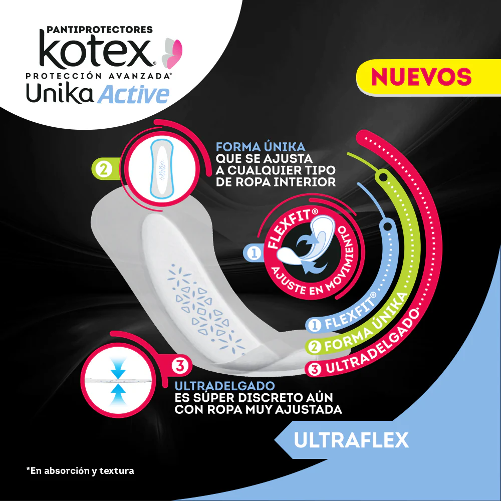 Siéntete libre, fresca y protegida con los Pantiprotectores Kotex® Unika Active, que te brindan la mayor comodidad y seguridad adaptándose al ritmo de tus movimientos aún en los más extremos.