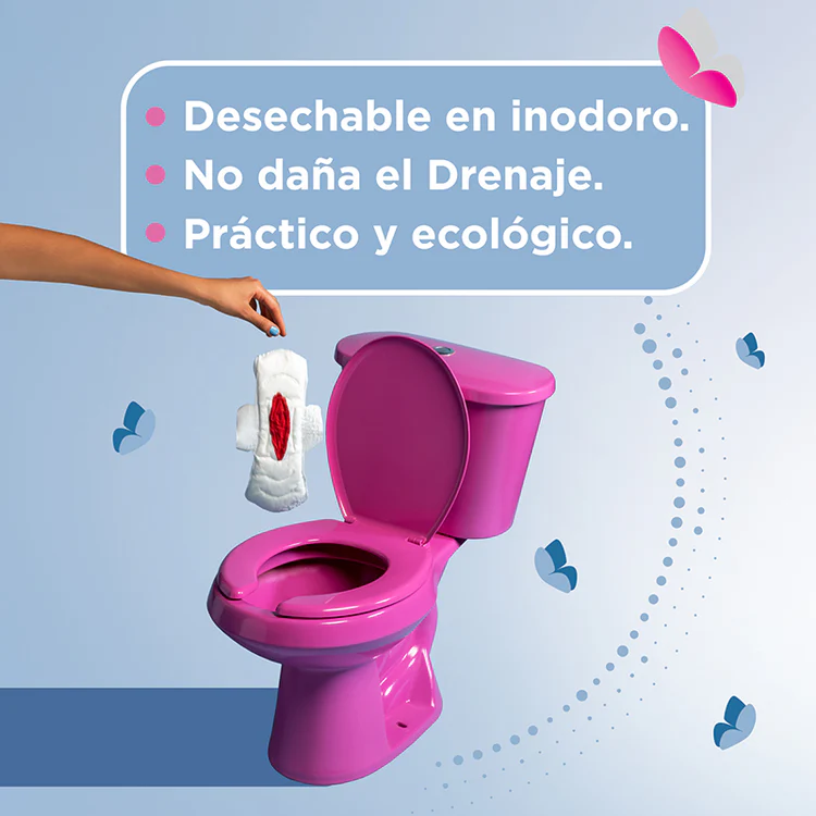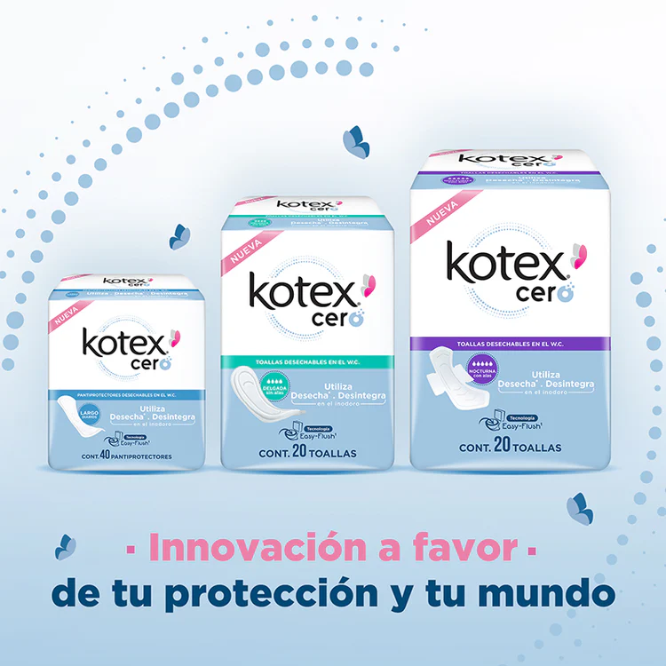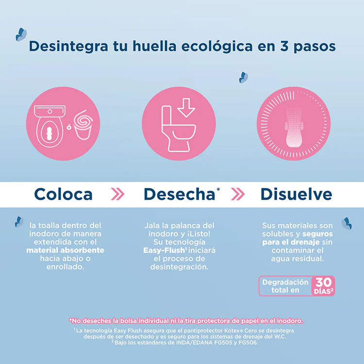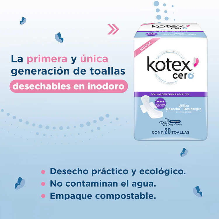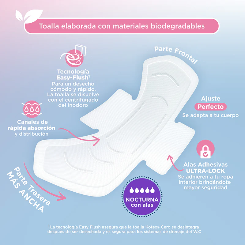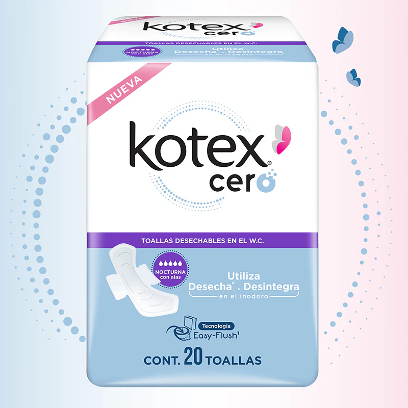 La primera generación de toallas desechables/desintegrables en indoro. Kotex Cero Nocturna con Alas, cuenta con canales de rápida y fácil absorción y distribucción para manterte seca todo el tiempo.