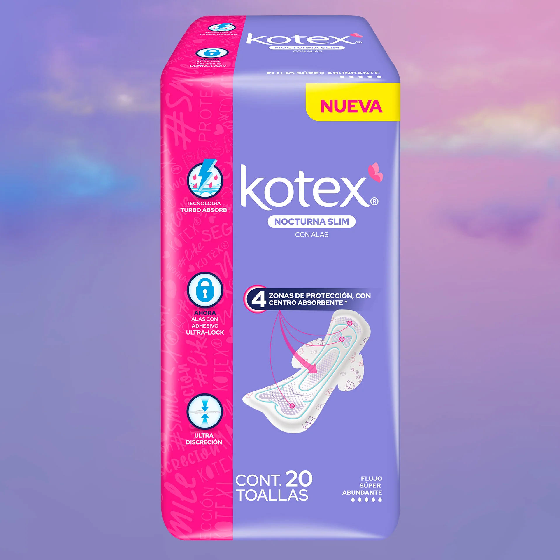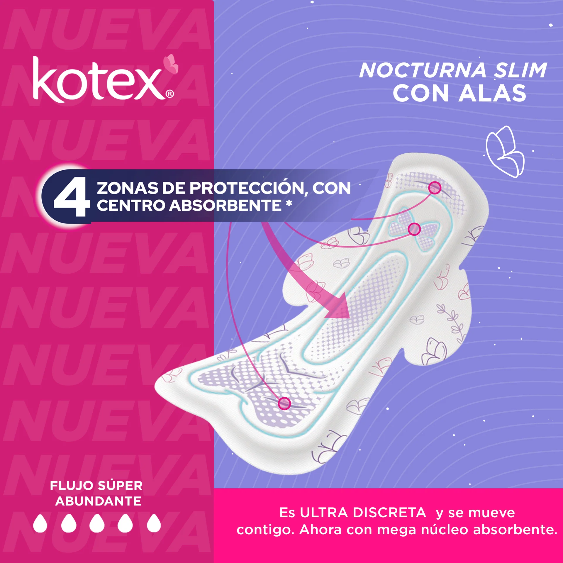 Las NUEVAS toallas Kotex® Nocturna Slim son ULTRA DISCRETAS pero absorben mucho y rapidísimo. Cuentan con 4 zonas de protección con centro absorbente; son ideales para flujo súper abundante.