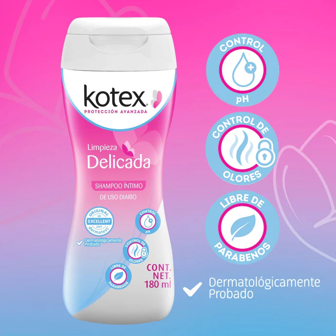 Nueva línea de cuidado íntimo Kotex® Limpieza delicada que ofrece shampoo y toallitas húmedas especialmente diseñados para mantenerte limpia y libre olores preservando el pH natural de tu zona íntima.